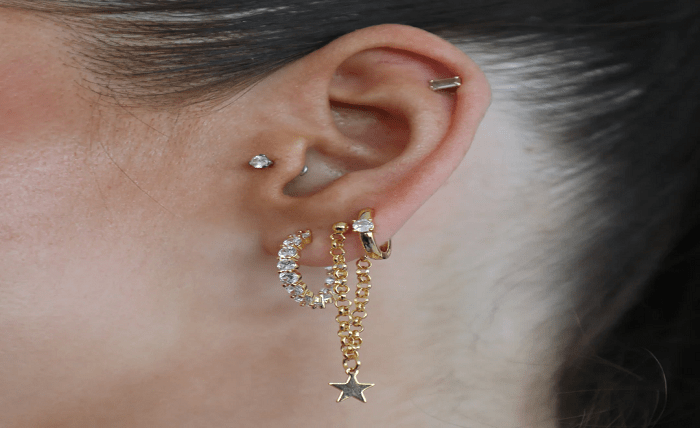 Another captivating styling option involves layering Heart Huggies and Embossed Star Earrings. Wearing both sets simultaneously, with Heart Huggies snugly hugging the earlobe and Embossed Star Earrings cascading below, creates a layered effect that adds depth and dimension to the overall look. This dynamic combination is particularly well-suited for special occasions where a touch of glamour is desired.